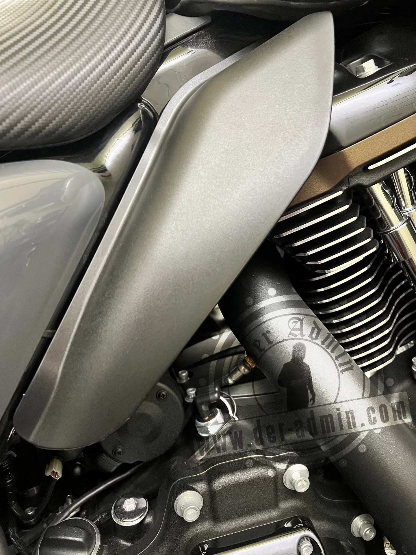 Der Anschluss liegt dadurch etwas versteckt, ist aber trotzdem gut erreichbar. Außerdem hat es noch einen praktischen Nebeneffekt: Da sich der Anschluss auf der rechten Seite der Maschine befindet, muss das Ladekabel vom Ladegerät zur Harley nicht besonders lang sein und auch nicht über die Maschine gelegt werden – zumindest dann nicht, wenn das Ladegerät in der Garage ebenfalls rechts an der Wand hängt … so wie bei mir. 😂